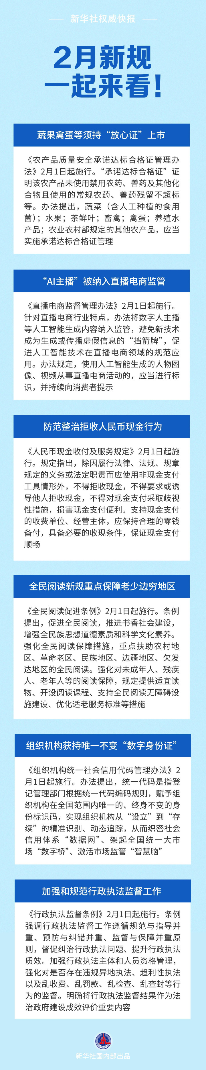 蔬果禽蛋等须持“放心证”上市;“AI主播”被纳入直播电商监管;防范整治拒收人民币现金行为……2月新规一起来看!